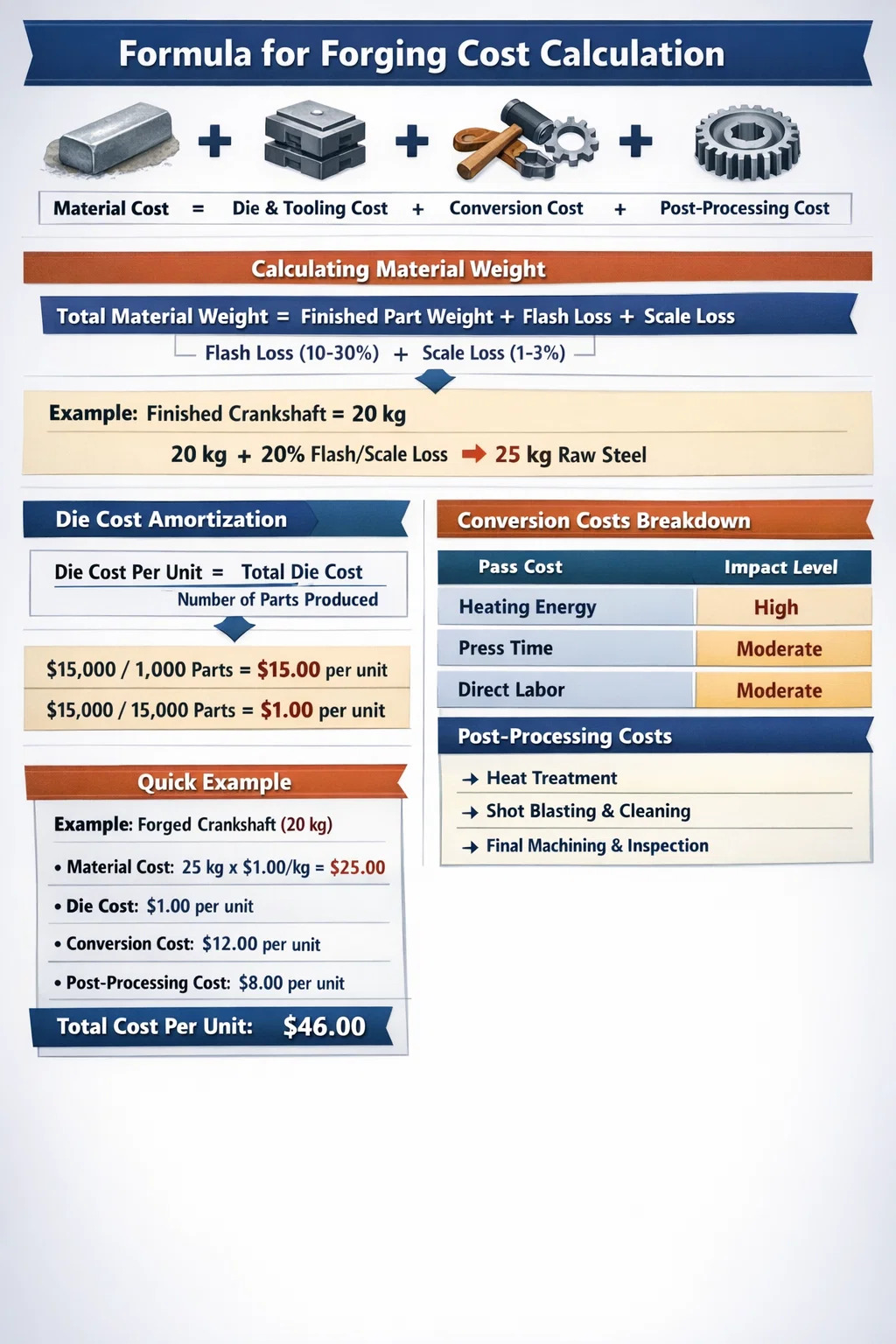 Toplam maliyetin hesaplanması çelik dövme dört temel sütunun toplanmasını içerir: Malzeme Maliyeti (net ağırlık artı flaş kaybı), Takım/Kalıp Maliyetleri (üretim süreci boyunca amortismana tabi tutulur), Dönüşüm Maliyeti (enerji, işçilik ve makine genel giderleri) ve İşlem Sonrası Maliyetler (ısıl işlem ve işleme). Standart orta boy bir dişli için malzeme genellikle toplam birim fiyatın %40 ila %50'sini oluştururken, takımlar en büyük ön değişkendir.