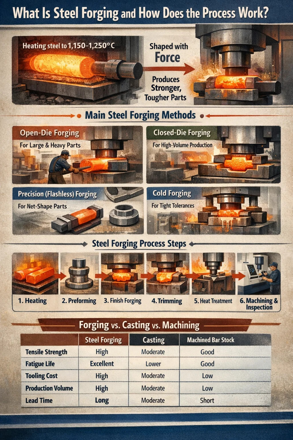 Çelik dövme tek bir teknik değildir. Her biri farklı geometrilere, hacimlere ve tolerans gereksinimlerine uygun olan birkaç farklı yönteme ayrılır. Her yöntemin nasıl çalıştığını ve nerede yetersiz kaldığını anlamak, bir dövme projesinde doğru kararı vermeye çalışan her mühendis veya alıcı için başlangıç noktasıdır.