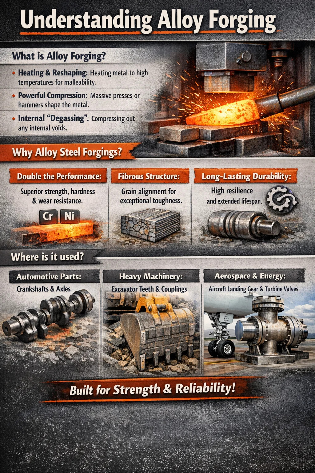 Ağır Makineler: Ekskavatörlerin ve buldozerlerin kayalarla doğrudan temas eden "dişleri" ve eklemleri genellikle alaşımlı çelik malzemeler kullanır. Havacılık ve Enerji: Uçak iniş takımları ve enerji santrallerindeki büyük valfler gibi kritik ve zorlu ortamlarda, neredeyse yalnızca alaşımlı dövme malzemeler kullanılır.